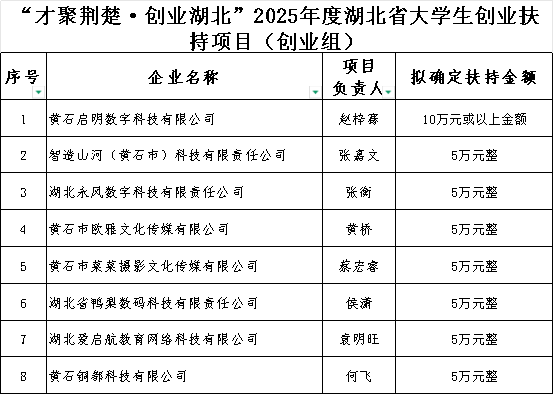 近日,湖北省人力资源和社会保障厅、湖北省教育厅、共青团湖北省委员会联合发布了《关于2025年度湖北省大学生创业扶持项目(创业组)拟扶持项目名单公示》。湖北理工学院慧谷大学生创业孵化园8家孵化企业成功入选,其中1家获10万元或以上金额的重点扶持,7家获5万元专项支持,扶持覆盖面与资金规模均创园区年度新高。这一成果既是对创业企业创新实力的肯定,更彰显了园区全链条、精准化的孵化服务成效。